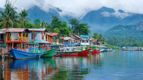 A flotilla of vessels bobbed atop a serene lake adjacent to a verdant, forested peak capped with clouds