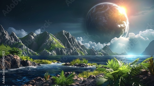 A landscape painting with towering mountains, a tranquil body of water in the foreground, and a faint planet in the far-off background