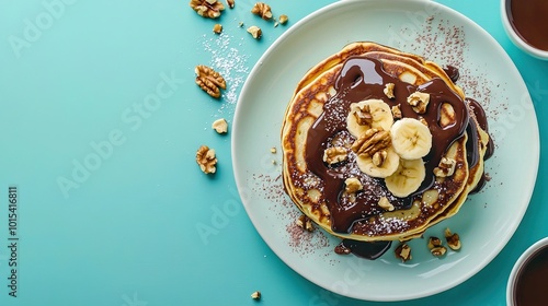 A plate with golden pancakes topped with bananas and walnuts sits beside a steaming cup of coffee