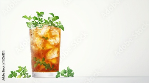 A tall glass brimming with a refreshing beverage adorned with lush green foliage and a sprig of fragrant mint
