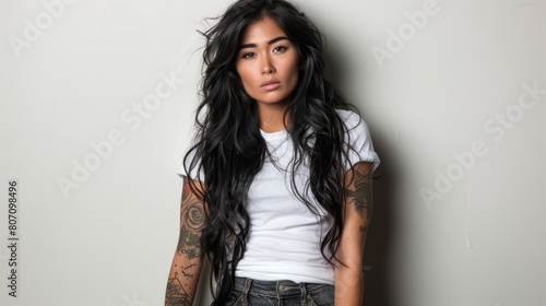 A woman with long black hair and tattoos adorns her arms Leaning casually against a wall, she rests a hand on her hip