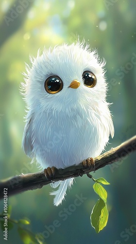 An owl perched atop a leafy green branch against a lush forest backdrop