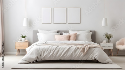 Blank white canvas art mockup displayed above a light grey bed with fluffy pillows, soft white bedding, and pastel wall background