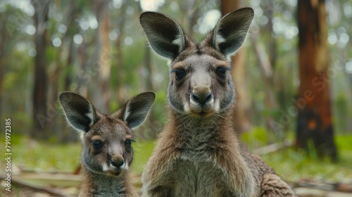 Two kangaroos standing side by side in a forest, background filled with trees