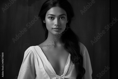 a beautiful asianwoman in a white dress, strong facial expression, dark white and dark brown, simple, multi-layered