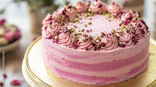 A beautifully decorated pink cake adorned with rose petals and creamy frosting, set on a golden platter, creating an elegant dessert for special occasions.