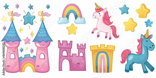 A charming and colorful illustration featuring playful unicorns, a fairytale castle, stars, moons, and rainbows.