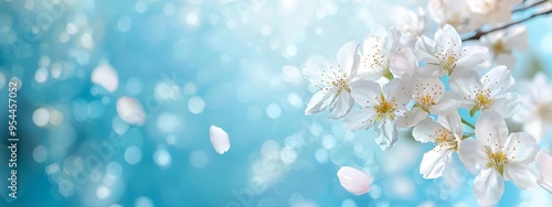 A cherry tree branch, adorned with white flowers, lies in the foreground; the backdrop is a tranquil blue sky