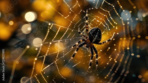 a close up of a spider's web with drops of dew on it's back and a blurry background of trees and yellow lights in the background.