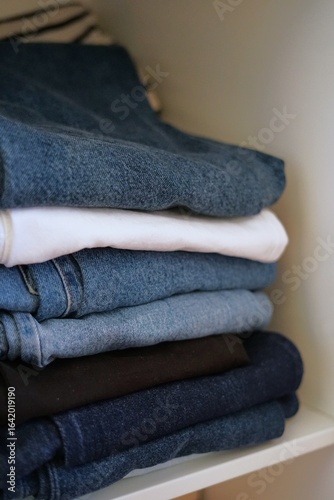 A close-up shot of a well-organized shelf in a closet, featuring neatly folded clothes in different denim shades,black,and white fabric.Perfect for illustrating organization,fashion,and home interion