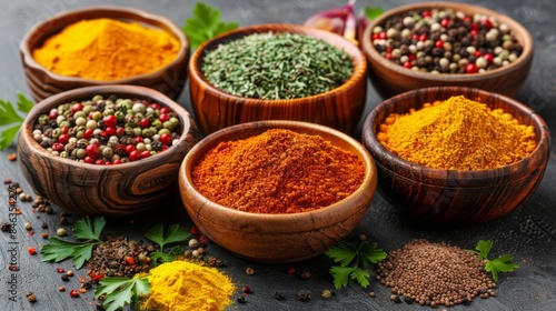 A collection of wooden bowls, brimming with assorted spices, sits adjacent to a mound of herbs and spices on the table