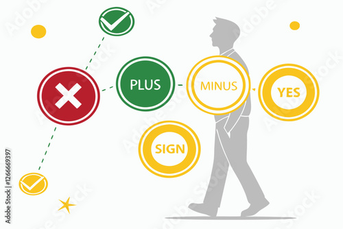A digital illustration featuring a central white silhouette of a person standing on a yellow circle. Surrounding the person are various icons on green and red circles, connected by arrows. The icon