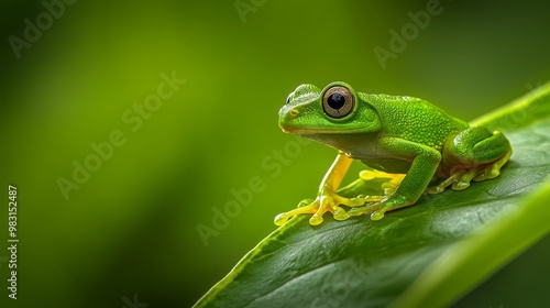 A frog sits atop a green leaf, hovering above a plant, with water drops adorning its surface
