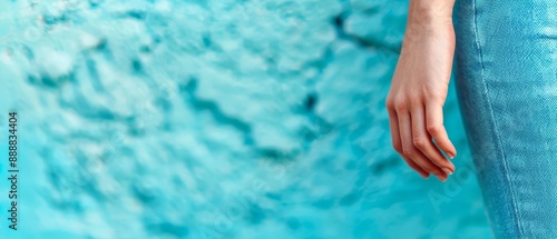 A hand, close-up, gripping a cell phone against a backdrop of tranquil, azure water