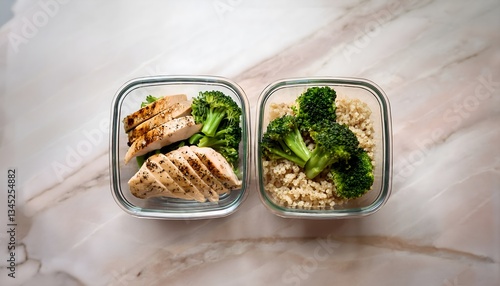 A perfectly arranged set of glass meal prep containers with simple, healthy ingredients.