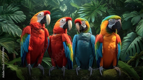 A quartet of colorful macaws perched in a lush jungle, exuding tropical vibrancy.