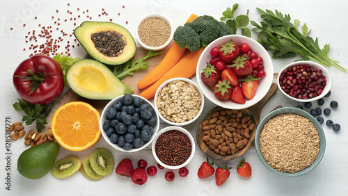 : A selection of healthy food items, including fruits, vegetables, seeds, superfoods, and cereals.