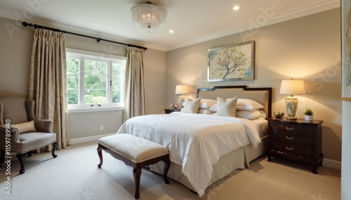 A serene bedroom features a large bed with white linens, a wooden nightstand with a lamp, a beige armchair, and a window with curtains, all set against a neutral color palette.