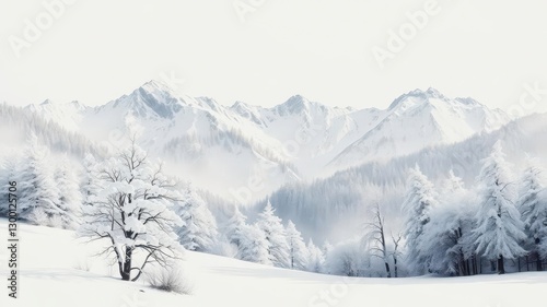 A serene winter scene in ink painting, with snow covered trees and distant mountains, all captured with elegant brushstrokes in