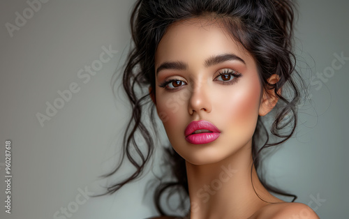 A stunning portrait of a beautiful Indian woman wearing ethnic clothing and traditional jewelry, featuring pastel pink lips and brown eye shadow against a grey background