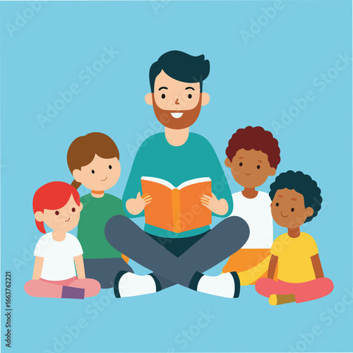 a teacher reading a book to a group of children, promoting education, learning, and the joy of reading in a classroom setting