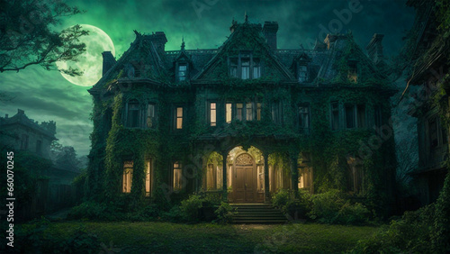 A towering, decrepit mansion looms in the moonlight. Its windows emit an eerie, greenish glow, and twisted, gnarled vines cover its facade. A spectral figure drifts near the front door.