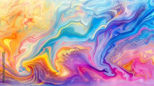 A vibrant fluid painting at the image's base, featuring swirling white, blue, yellow, pink, and purple hues