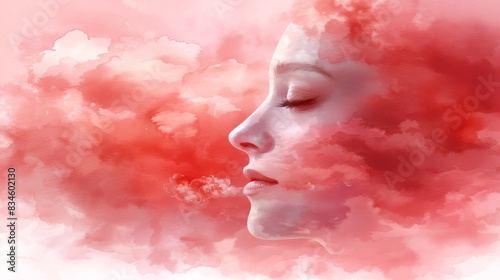A watercolor painting of a woman's face with closed eyes Behind her, red and white cloud formations shape a female head as the background
