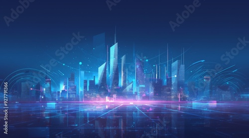 Abstract City Skyline with Glowing Lines and Blue Light Representing Data Technology Concept. Vector Illustration of a High-Tech Cityscape on a Dark Background