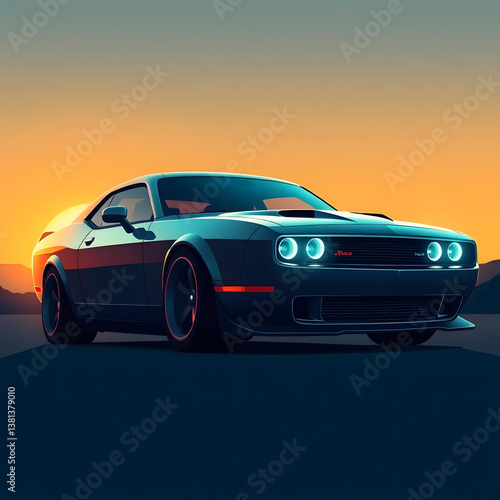 Abstract futuristic sci-fi style illustration, smooth gradient transition, sleek muscle car with glossy finish against a sunset art illustration design