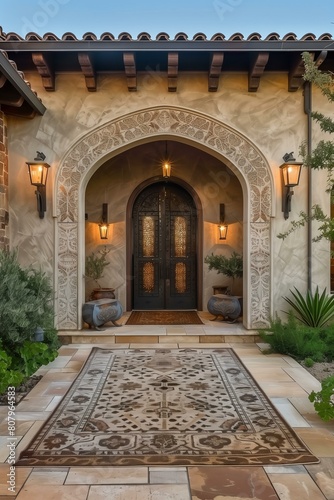 arch entry, arabesque style with intricate tile pattern muted earth tones