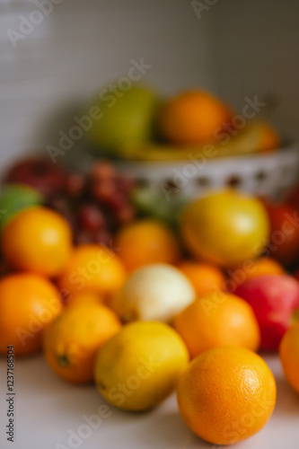 Assorted fresh fruits arranged on a kitchen counter with a basket with blurred background