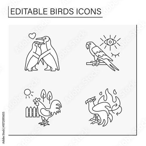 Birds line icons set. Different types of birds symbolize.Penguins, macaw, rooster and phoenix, Nature concept. Isolated vector illustrations. Editable stroke