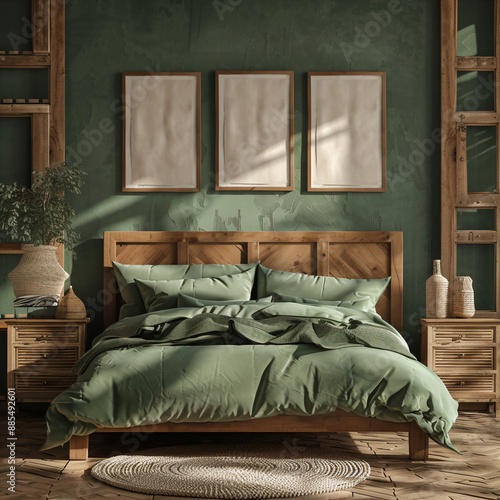 bohemian wooden bed with green pillows and bedside cabinets against green wall with posters frames
