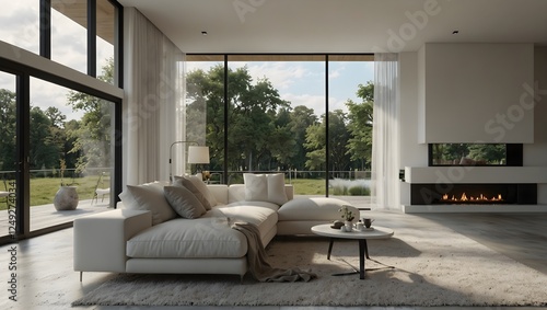 Bright and airy living room with large white sofa, modern fireplace, and floor-to-ceiling windows overlooking lush greenery
