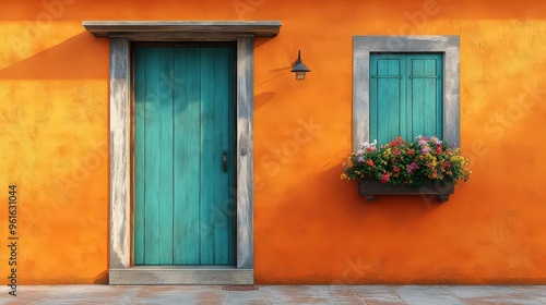 Bright turquoise door and window with flower box on an orange wall, evoking vibrant, colorful charm in a Mediterranean-style home.