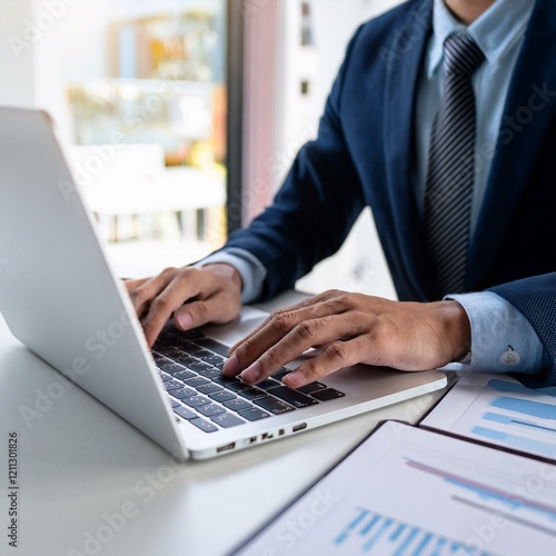 businessman typing on a laptop at a white desk in an office. His hands are actively working on the laptop, browsing the internet, and engaging in online tasks. Close-up view.