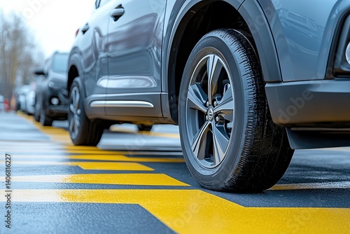 Close-up of car wheels parked on fresh asphalt with yellow zebra crossing lines, sharp focus on modern vehicle tires and road details.