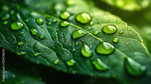 Collection of small raindrops on the veins of a leaf, macro view highlighting the clarity of the water, ultra-detailed close-up with a soft-focus background, natural and calming vibe