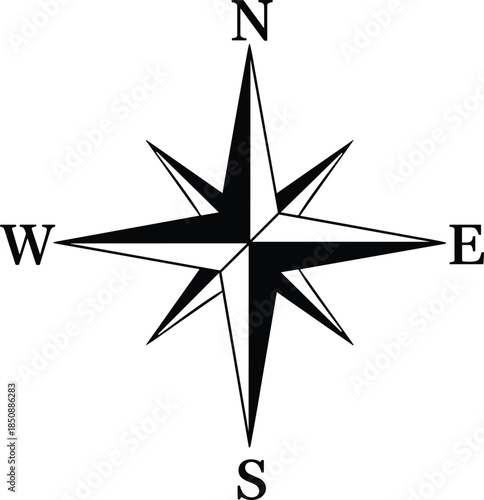 Compass rose direction symbol illustration, north south east west navigation icon, classic wind rose design for map orientation, travel guidance, minimal black vector graphic