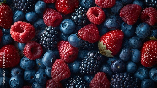 composition of mixed berries, such as strawberries, blueberries, raspberries, and blackberries, showcasing their varied shapes and colors.