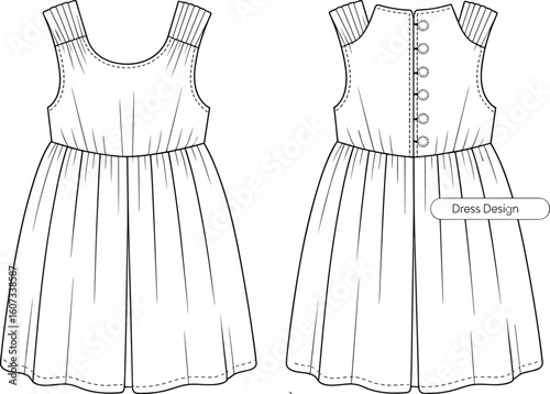 Cute Sleeveless Children's Dress Fashion Flat Front and Back Views with Button Closure and Pleated Details, Kids Apparel Vector