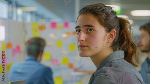 data analyst brainstorming ideas with colleagues in a modern office setting,