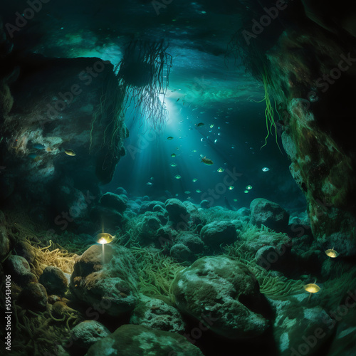 deep underwater cave with glowing bioluminescent creatures, rocks, and seaweed