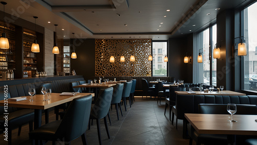 Elegant Restaurant Interior Modern Dining Space with Dark Accents and Warm Lighting Inviting Atmosphere for Fine Dining and Social Gatherings