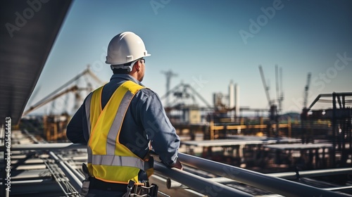 Engineer Technician Watching Team of Workers on High Steel Platform,