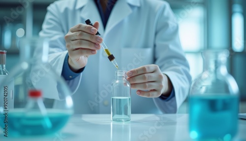 Experimenting with precision A scientist carefully dispenses a liquid into a flask