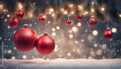Fantastic glowing background with snowy fir branches and red Christmas balls hanging with string