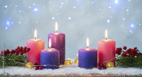 Four burning pink and purple candles arranged with evergreen branches and red berries on a snowy surface creating a festive winter holiday display