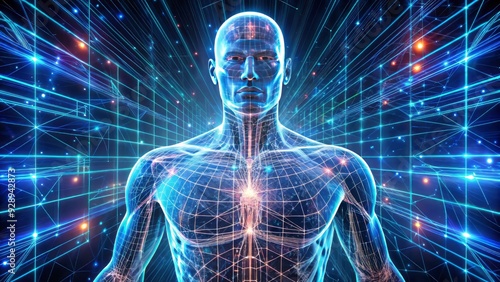 Futuristic digital avatar of a transparent human body with glowing circuits and wires, set against a dark blue background with neon grid lines.